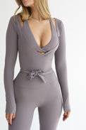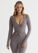 Inspired by timeless elegance, the Sophia Ballet Wrap Top effortlessly enhances your casual wardrobe or adds a touch of sophistication to your favorite athleisure looks. With a plunge front and a waist tie, this top is designed to enhance your hourglass. Wear over your favourite Glaze crop and elevate your look.